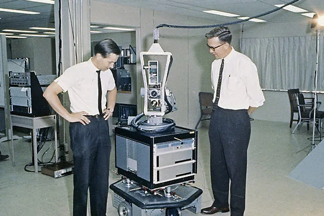 Sven Wahlström and Nils Nilsson with Shakey. Photo by SRI.